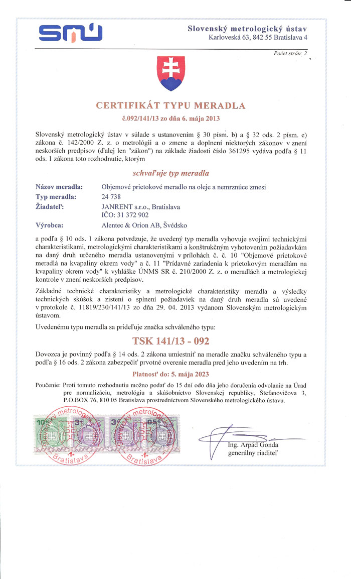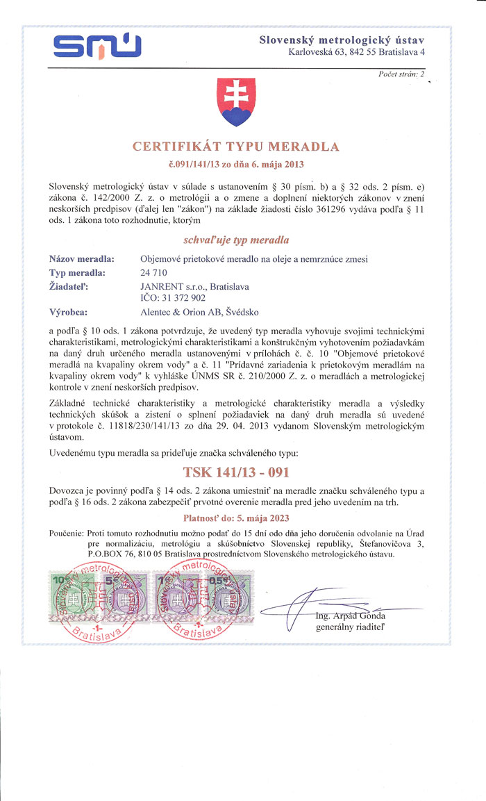 - Certifikát typu meradla – digitálny prietokomer, výdajná pištol, typ 24 710