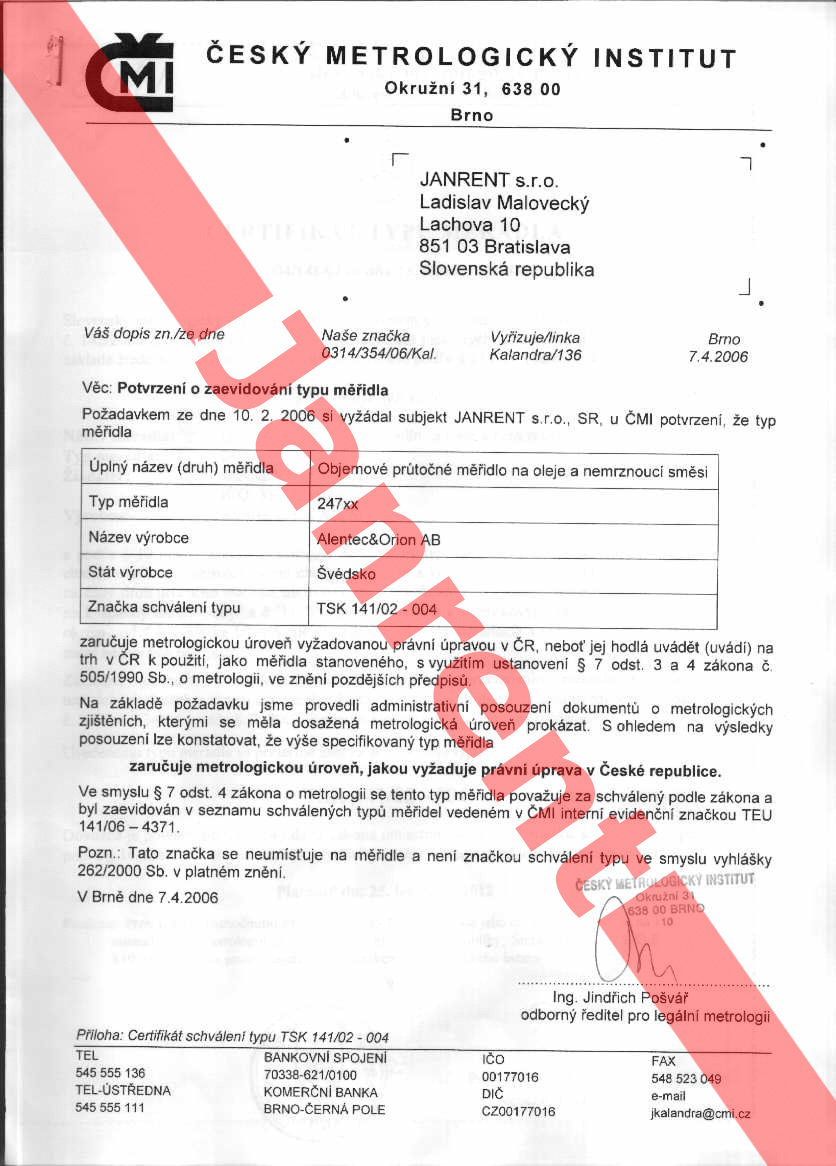 - Český metrologický inštitút - Potvrdenie o zaevidovaní typu meradla – 24 7XX