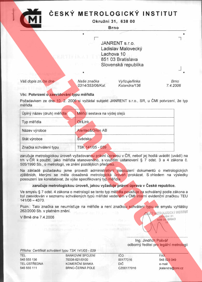 - Český metrologický inštitút - Potvrdenie o zaevidovaní typu meradla – OriLink