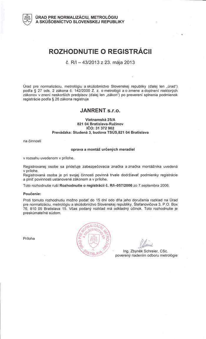 - Certifikát zástupcu registrovanej osoby na opravu a montáž určených meradiel