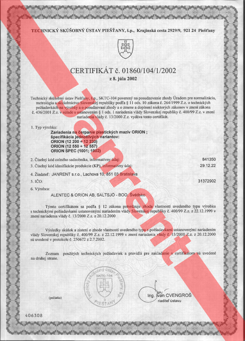 - Certifikát TSÚ š.p., Piešťany na pneumatické pumpy na plastické mazivá