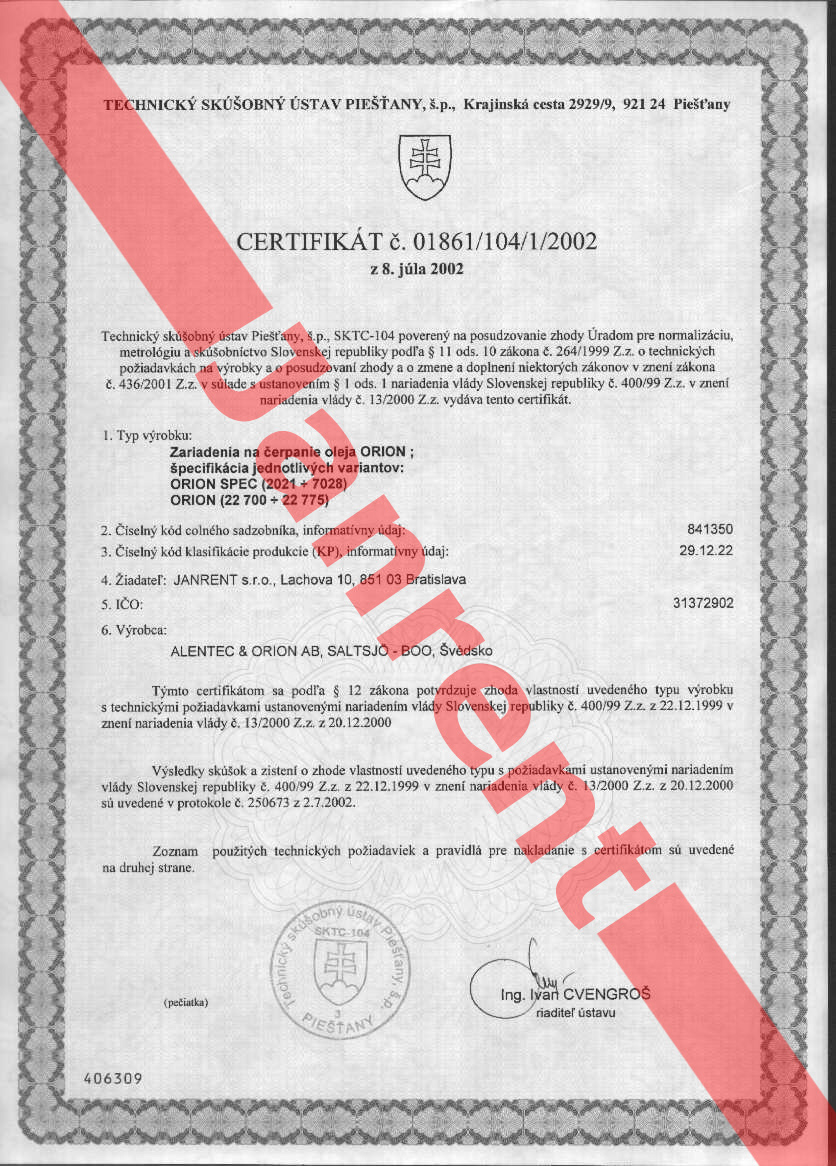 - Certifikát TSÚ š.p., Piešťany na pneumatické pumpy na oleje